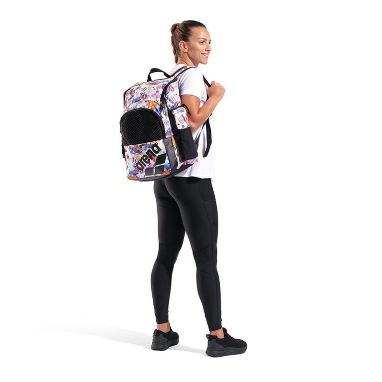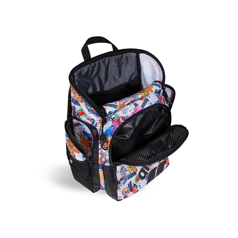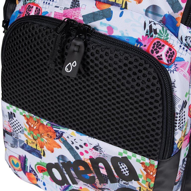 Gamme ARENA ONE GO. Conception compacte avec ouverture par le haut pour maximiser l’espace et ranger facilement vos essentiels. Le système de ventilation amélioré AQUABREATHE contrôle l’humidité et le panneau arrière respirant assure un transport sans transpiration. Matériaux déperlants. Compartiment pour ordinateur portable. Sangle pour trolley. Dimensions H46 X L38 X W23 (35L). Edition COLLAGE